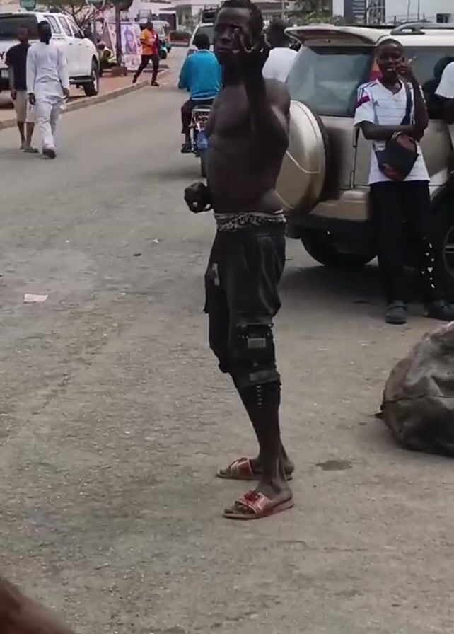 bare-chested man standing in the street, with a brace on his left leg and wearing dark shorts and sandals. He gesticulates with his hands. A man in a grey robe walks past him. A man on a bicycle offers the bike to the bare-chested man, who accepts it. He briefly pedals, then dismounts and strikes a dramatic pose, leaning forward with one arm outstretched. Other people stand around, several of whom are recording with their phones. In the background are cars, buildings, and a sign for "OPay Beyond Banking." The street appears to be paved and somewhat littered.