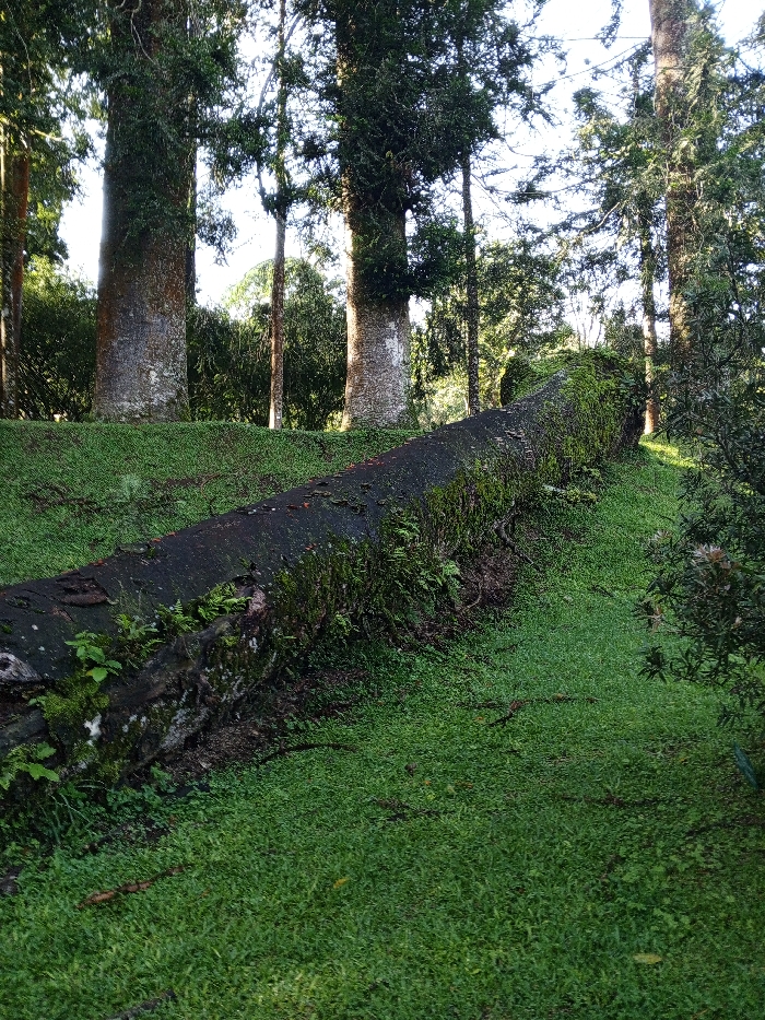 A large, moss-covered fallen tree trunk lies on a grassy slope