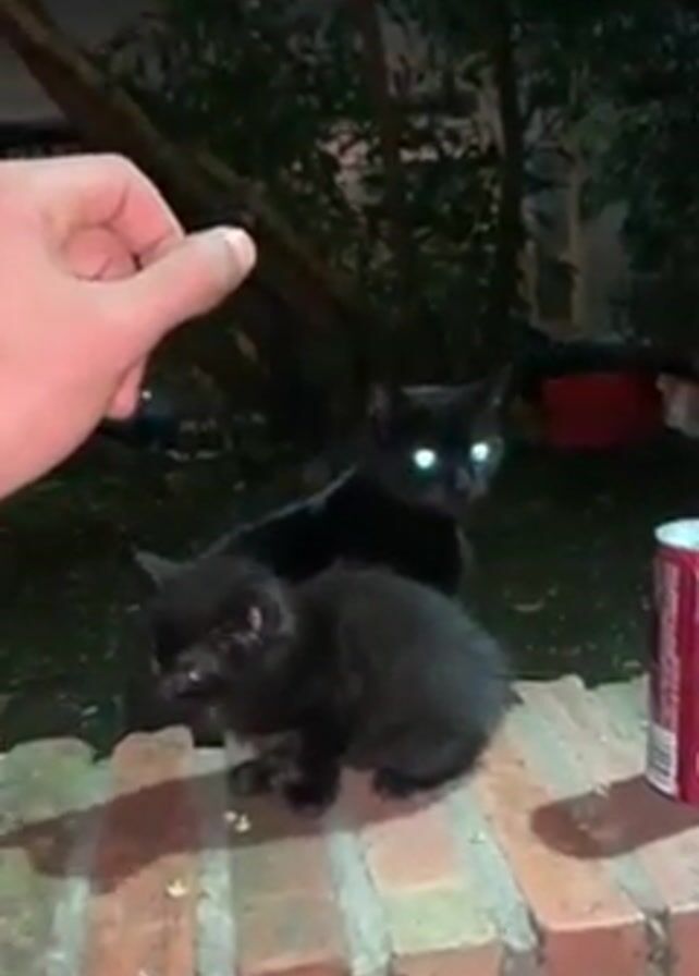 A man reaches out to pet a small black kitten that is sitting on a short brick wall. An adult black cat sits behind the kitten, with its eyes glowing. The scene is dark. There are trees and part of a building in the background. A can is visible on the wall near the cats.