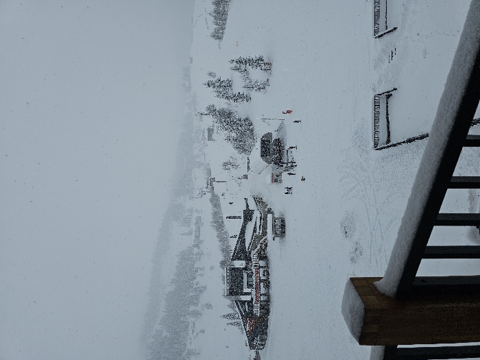 The image depicts a snow-covered ski resort landscape in Goderdzi, Georgia, under active heavy snowfall. The scene is viewed from an elevated position, with a snow-laden dark railing and a wooden post occupying the foreground. In the midground, a broad expanse of snow features distinct ski tracks. To the left, a large multi-story lodge-type building with illuminated signs, identified by "Goderdzi" text, stands amidst the snow. To the right of the lodge, a ski lift base station is active, with several chairs ascending the slope. Approximately 10-15 individuals, some appearing as skiers or snowboarders, are present near the lodge and the ski lift base. One person in a red jacket is visible on the snow further right. Scattered evergreen trees, heavily frosted with snow, dot the terrain. In the background, snow-covered mountains and forested slopes recede into the overcast, gray sky, which is filled with visible falling snowflakes, indicating ongoing precipitation and low visibility conditions. Two snow-covered dark wooden or metal deck structures are partially visible in the lower right, below the main activity area.