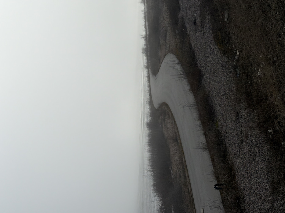 The image depicts an outdoor scene in Kronstadt, Russia, characterized by dense fog or heavy overcast conditions that severely restrict visibility and create a uniformly diffused light. A dark, winding asphalt road, appearing damp, traverses the midground, curving from the lower left to the right, running parallel to a body of water. A small, dark, U-shaped metal object is partially visible near the left edge of the road in the foreground. Sparse, bare deciduous shrubs and thin trees with dark branches line both the landward side of the road and the immediate edge of the water. The ground cover consists of dry, brown grasses and patches of dark, gravelly soil, with some light-colored debris visible in the lower right foreground. A calm body of water, likely a bay or gulf, extends from the vegetation line towards an indistinct, fog-obscured horizon, its surface reflecting the muted sky. No individuals, vehicles, or active subjects are present.
