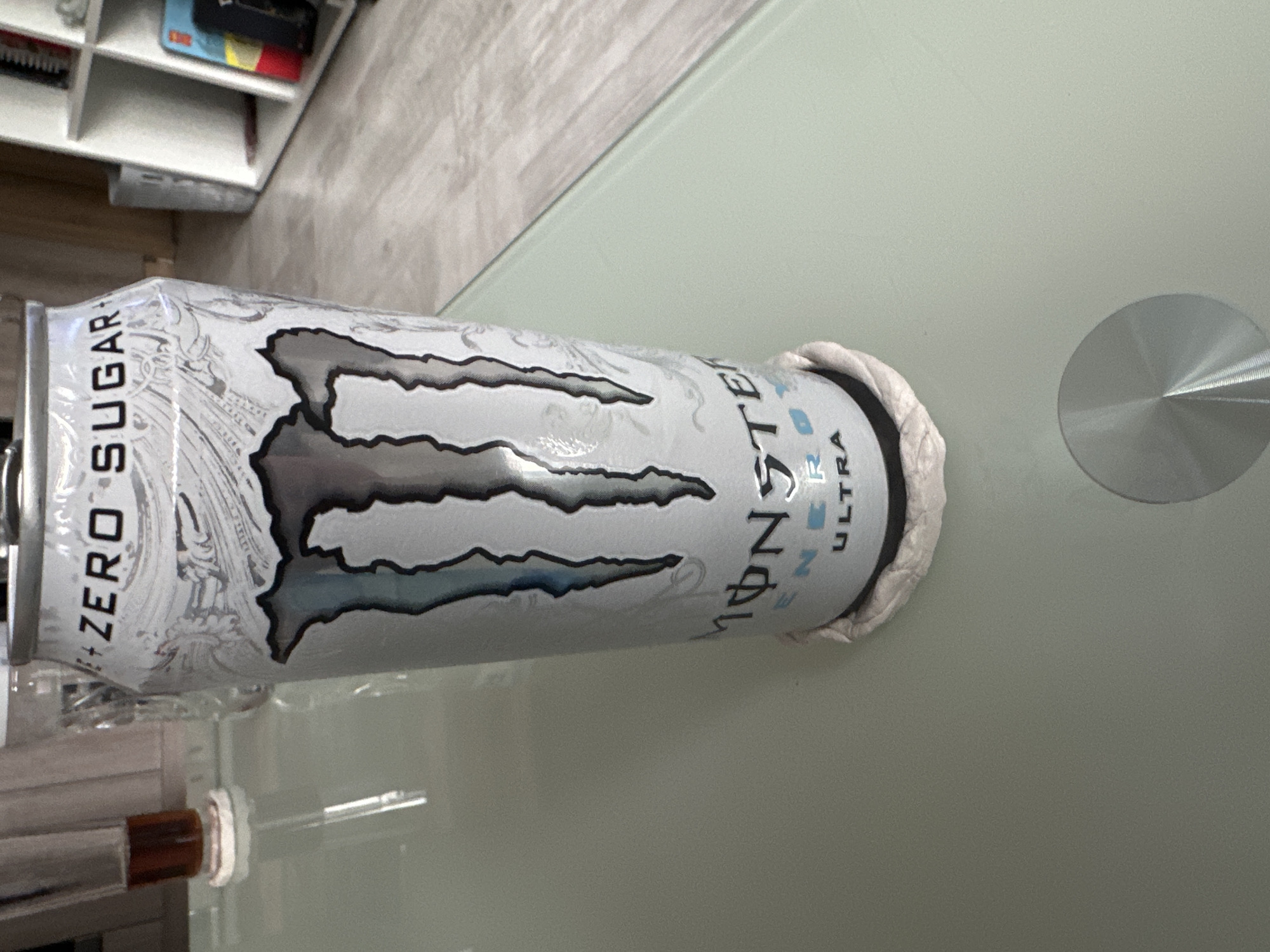 The image depicts an indoor scene in the city of Varna, Bulgaria. A tall, cylindrical aluminum can of "Monster Energy Ultra Zero Sugar" is centrally positioned on a light-colored, braided circular coaster. The can is primarily silver and white with a prominent black and light blue claw logo. To the upper left, a clear glass containing a dark brown liquid, possibly a beverage, rests on an identical light-colored, braided circular coaster. Both items are situated on a reflective, light-toned glass tabletop. In the background, a white shelving unit with multiple cubic compartments is visible, containing various indistinct objects including what appear to be books or boxed items. The floor in the distant background is light-colored, likely laminate or wood. No individuals are present, and no active interactions are occurring.