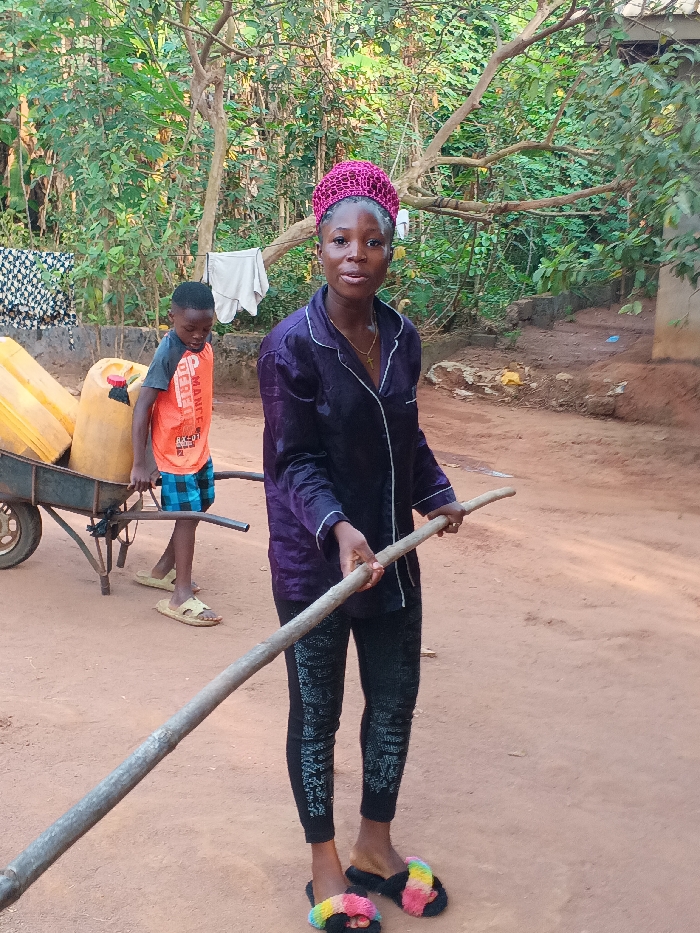 An outdoor scene in Eziudo, Nigeria, depicts two individuals on reddish-brown dirt ground. A female adult, positioned centrally, faces forward, holding a long, light-colored wooden stick horizontally with both hands. She wears a dark purple long-sleeved shirt, black patterned leggings, a pink crocheted head covering, a gold-colored cross pendant, and multicolored fluffy slides. To her left and slightly behind, a male child operates a dark-colored metal wheelbarrow loaded with two yellow plastic jerry cans. He wears an orange t-shirt, blue checkered shorts, and light sandals. In the background, dense green foliage and trees are visible, along with hanging clothes (white and patterned) and a portion of a light-brown building structure on the right.
