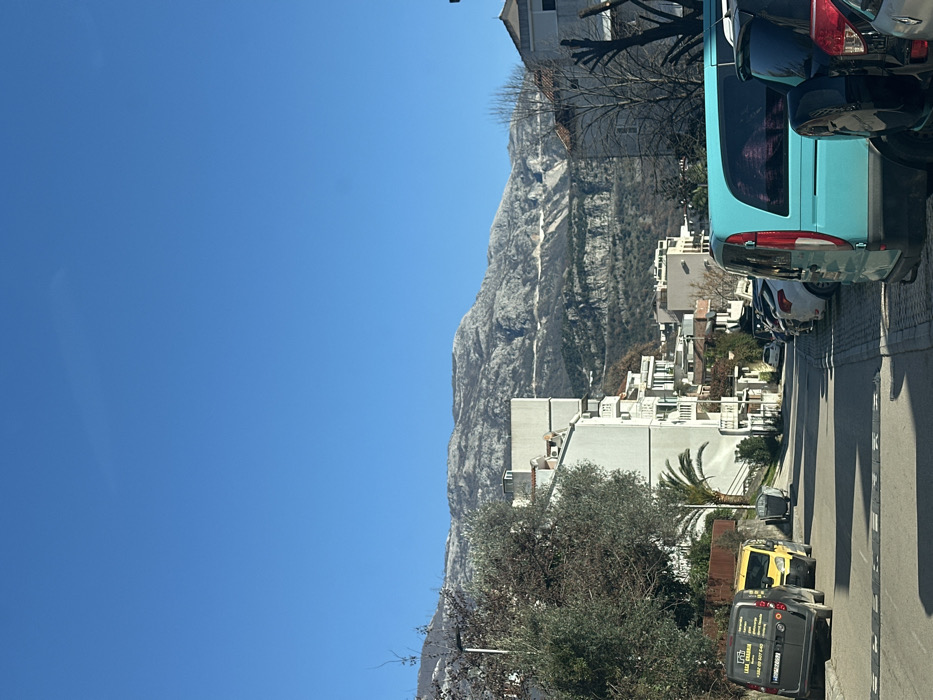 This image captures a residential street scene in Budva, Montenegro, under a clear, bright blue sky
