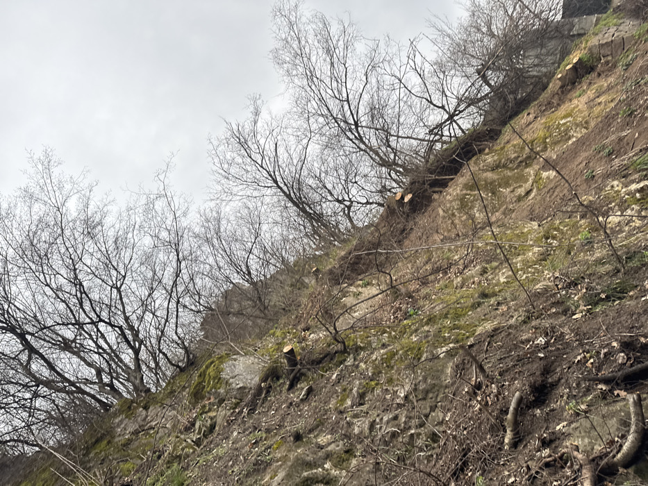 The image displays a steep, rocky hillside or embankment located in Belovo, Bulgaria, under an overcast sky. The incline features exposed rock formations interspersed with areas of loose earth and scattered organic debris. Patches of green moss are visible on some rock surfaces. Numerous deciduous trees with bare branches populate the slope and crest. Distinct evidence of recent tree felling is present, marked by several light-colored tree stumps and cut branches situated along the mid-to-upper sections of the slope. No individuals, animals, or active human interactions are depicted.