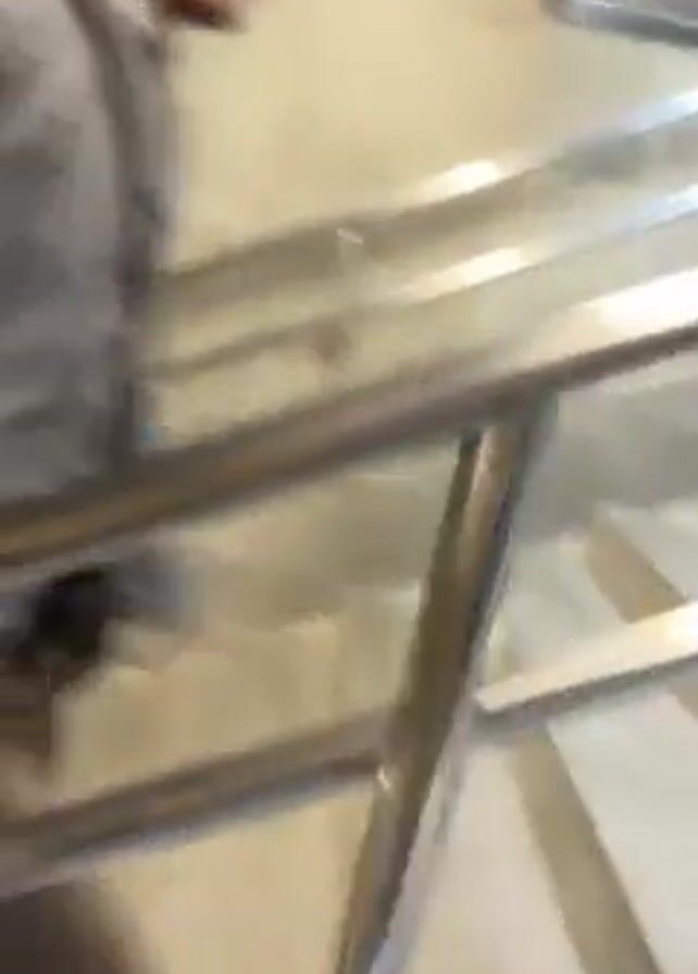 A person walks quickly down a set of concrete stairs while gripping the silver handrail on the right side. They move off-screen to the right, and the camera then pans to show a moving escalator with yellow accents.