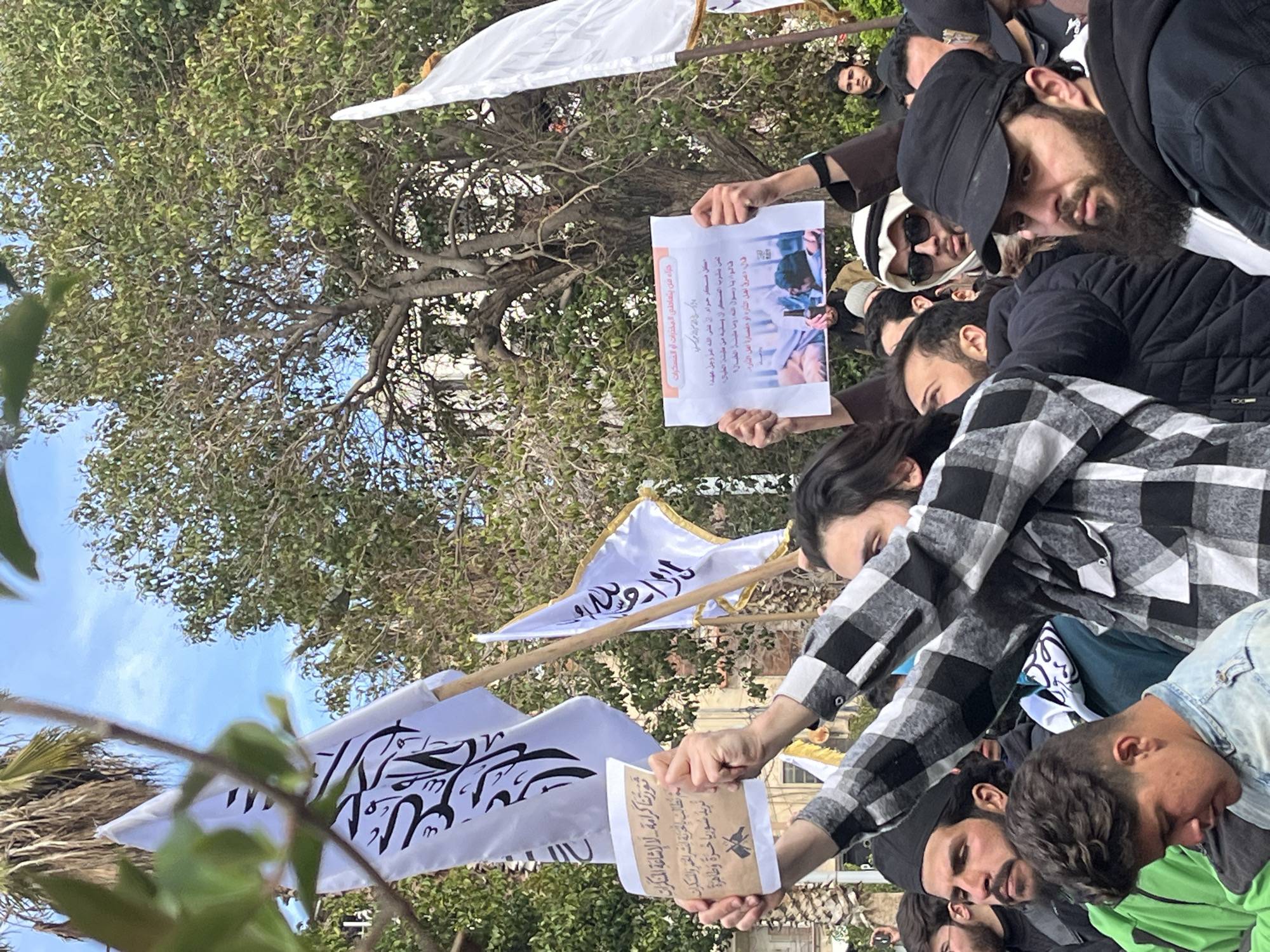 The image displays a daytime outdoor gathering of numerous men in As-Salihiya Municipality, Syria