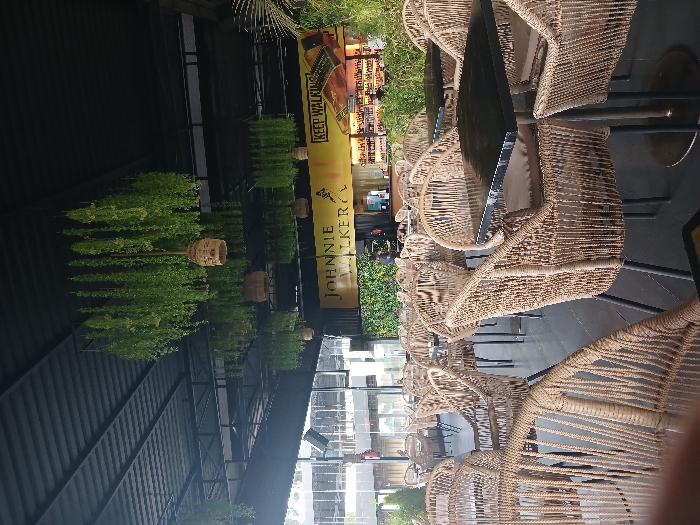 restaurant patio with wicker chairs and tables, located at the coordinates -1.109 latitude and 36.71 longitude in Riara Ridge, Kenya. The patio is covered by a black metal awning with hanging green plants. The restaurant is adorned with a sign reading "JOHNNIE WALKER" and "KEEP WALKING". The chairs and tables are arranged in rows, with the chairs facing the tables. There are a few people in the background, sitting at the tables. The image is taken from a low angle, looking up at the patio.
