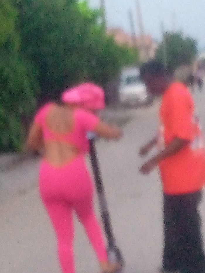 A blurry image shows two people on a street. A woman in a bright pink outfit, including a cap, stands with her back to the camera next to a scooter. She has a low back dress or top. A person wearing an orange shirt and dark pants is standing facing the woman. The background includes trees and a blurred white vehicle.