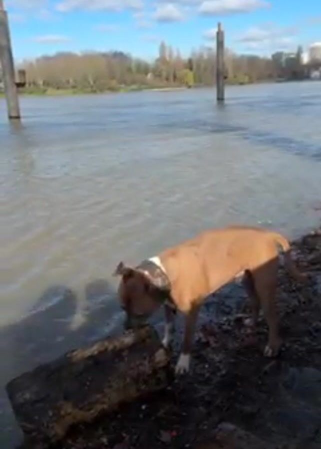 A brown and white dog stands on a muddy bank near a river, biting a log at the water's edge. The river is wide and murky. In the background, there are trees, buildings, and wooden posts sticking out of the water. The sky is blue with some scattered clouds. A person in a black puffer jacket approaches the dog.