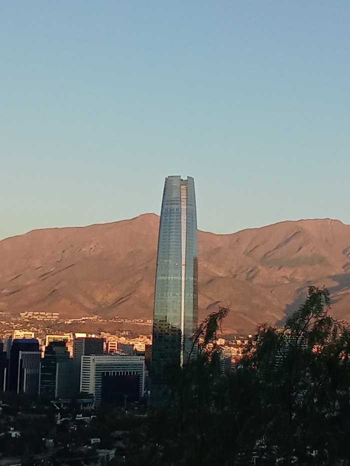 A tall glass skyscraper dominates the scene, with a backdrop of a light-orange mountain range under a clear blue sky. Trees obscure the lower right foreground. Other buildings of varying sizes can be seen near the base of the skyscraper. The lighting suggests it is either sunrise or sunset.