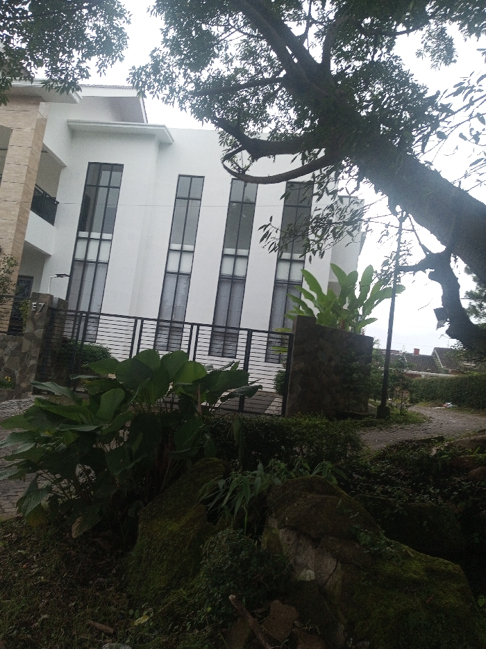 The scene depicts the exterior of a modern residential building in Cipanas, Indonesia, viewed from a slightly lower vantage point