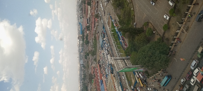 An elevated vertical photograph depicts a bustling urban landscape in Nairobi, Kenya. The sky, occupying the top quarter of the frame, is light blue with scattered white cumulus clouds. The foreground features a multi-lane asphalt road, partially visible at the bottom, heavily congested with numerous parked and slow-moving vehicles, predominantly cars and a prominent light blue bus. Pedestrians actively traverse the sidewalks adjacent to the road. A white concrete barrier separates the road from a treelined pedestrian area and a circular traffic island. The midground is dominated by a vast, multi-level bus terminal. Hundreds of buses, predominantly white but including some blue and yellow units, are parked in dense rows and lanes within the terminal infrastructure. An elevated grey concrete structure, possibly a pedestrian bridge or part of the terminal, extends horizontally through the center of the image, adorned with green banners. Pedestrians are observed moving throughout the terminal's various levels and structures. The background reveals an extensive cityscape stretching to the hazy horizon. It comprises a dense matrix of low to medium-rise commercial and residential buildings, interspersed with industrial facilities. A slender communication tower is visible in the distant urban expanse. The overall scene indicates a high volume of vehicular and pedestrian traffic within a major metropolitan transport hub.