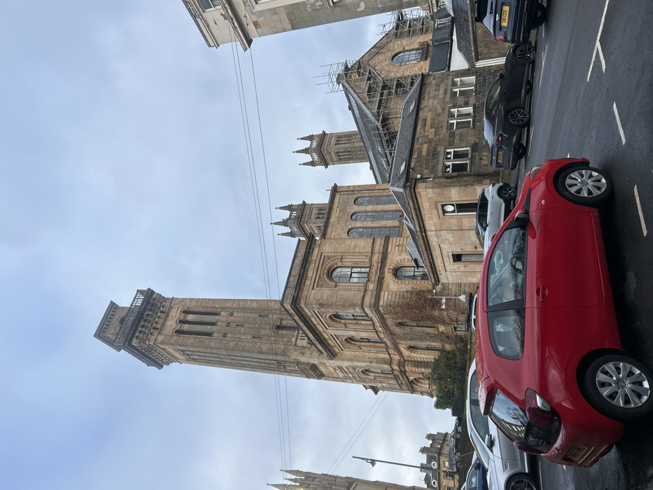 An urban scene features a tall, ornate, stone church tower under a cloudy sky. The church, constructed of light brown stone, exhibits intricate architectural details including arched windows and spires. A street runs alongside the building, filled with parked vehicles. The red car dominates the foreground. Wires stretch across the sky. Scaffolding partially obscures the adjacent building.
