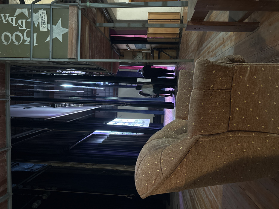 The image captures a view from the backstage or wing area of a theater in Cherven Bryag, Bulgaria. In the immediate foreground, a brown, U-shaped armchair with a textured fabric featuring small, light-colored speckled patterns is positioned on a worn wooden plank floor, facing away from the camera towards the stage. Dark blue and black stage curtains are partially drawn on the left and center, revealing a segment of the wooden stage floor beyond. Three individuals stand in the midground, near an opening between the stage curtains. One person, positioned to the left, wears a light-colored top and dark pants. Another individual, centrally located, wears a light shirt and dark pants, facing away from the camera. The third person, to the right, wears dark clothing, also facing away. Their postures suggest observation or readiness. Above the stage floor, behind the individuals, two large, illuminated white screens or banners are suspended, displaying partially visible text in what appears to be Cyrillic script. Numerous vertical stage rigging lines and support structures, along with stage lighting fixtures, are visible extending upwards into the dark overhead space. On the right side of the image, a multi-tiered metal shelving or scaffolding unit is prominent. Its upper section features a green panel with the white text "1300 България" (1300 Bulgaria) and a white star symbol. Below this, another green panel displays fragmented white text in Bulgarian, including "ВНИМАНИЕ!" (Attention!). Wooden planks form shelves or platforms on this structure. Below the scaffolding, on a beige wall, wooden cabinets and exposed electrical control panels are visible. The overall environment suggests an active, utilitarian theater space.
