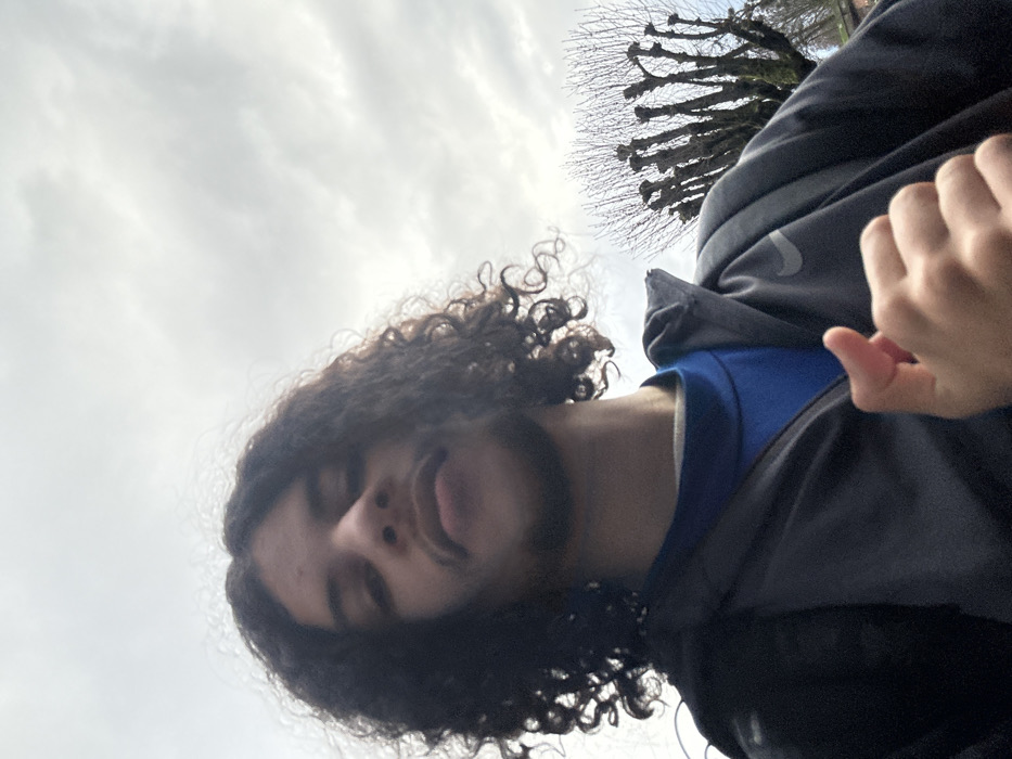 The image depicts a young male subject positioned outdoors against an overcast sky. The subject has dark, curly hair extending to his shoulders, a light mustache, and a light beard. He is wearing a blue crew-neck shirt under a dark grey or black zip-up jacket, which displays a white Nike swoosh logo on the left chest area. His right hand, lightly clenched, is visible in the lower right portion of the frame. The subject's gaze is directed towards the camera. In the background, partially to the right of the subject, are the bare, heavily pruned branches of several deciduous trees, indicative of winter or early spring. The scene is situated outdoors in Strasbourg, France. No specific architectural or geographical landmarks are discernible to pinpoint a precise location within the city.