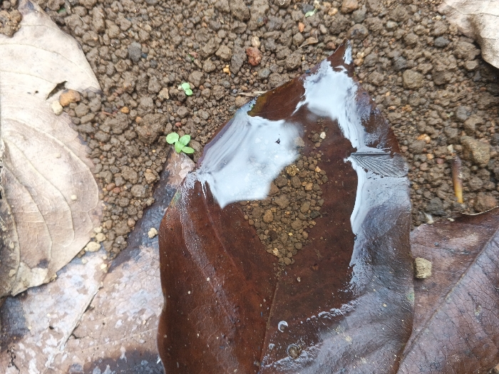 A close-up shows a wet, decaying brown leaf resting on soil. Water pools on its surface, reflecting light. Smaller dry leaves surround it. Tiny green seedlings sprout from the soil near the wet leaf's edge. The soil is moist and dark, with varying textures and small clumps. A stick and debris are scattered around the scene.
