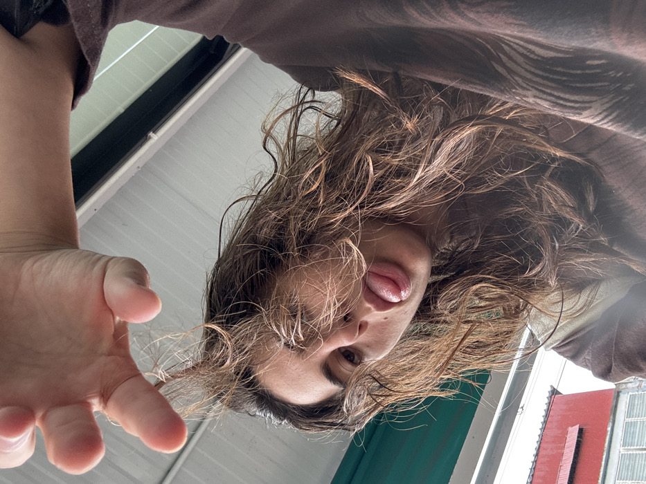 A person with wet, long brown hair looks down into the camera, sticking out their tongue