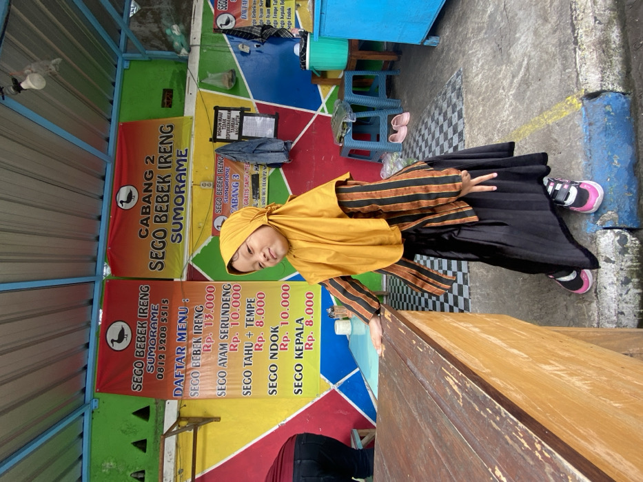 A child in traditional attire stands next to a wooden surface in front of a restaurant. The restaurant, "Sego Bebek Ireng Sumorame," features colorful signage listing various menu items like "Sego Bebek Ireng," "Sego Ayam Serundeng," and "Sego Tahu + Tempe," along with their respective prices. The restaurant's other branches, "Cabang 2" and "Abang 3," are also advertised. Blue and green plastic furniture and baby shoes sit in the background.