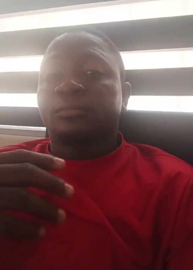 A man wearing a red shirt is sitting in front of blinds. He raises his hand to his chin, and then moves it to his neck.