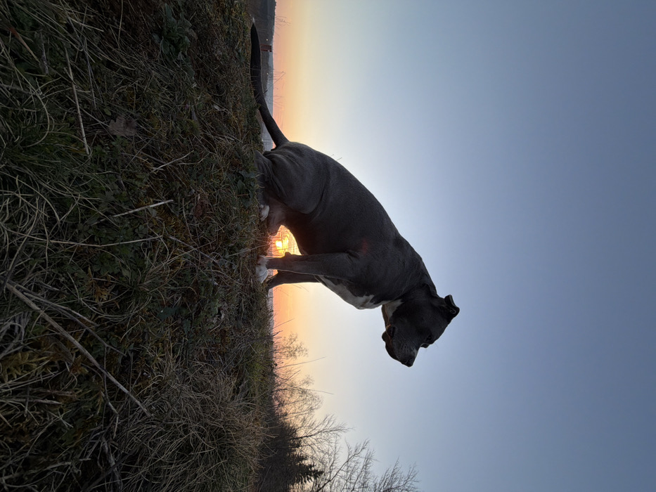 The image displays a dark grey American Staffordshire Terrier type dog, seated in profile and facing right, positioned on an elevated, grassy, and moss-covered mound. The dog possesses short fur and distinct white markings on its paws. A low sun, casting an intense orange and yellow glow on the horizon, is visible directly behind the dog, indicating either sunrise or sunset. The sky transitions from this bright hue at the horizon to a clear, pale blue overhead. To the left of the frame, distant urban or industrial structures are silhouetted against the bright sky, indicative of an overlook in the city of Schifflange, Luxembourg. To the right, sparse, bare trees and brush are visible against the twilight sky, with a denser line of foliage further in the background. The immediate foreground consists of dry grass and scattered vegetation. No other individuals or animals are present in the visible scene.