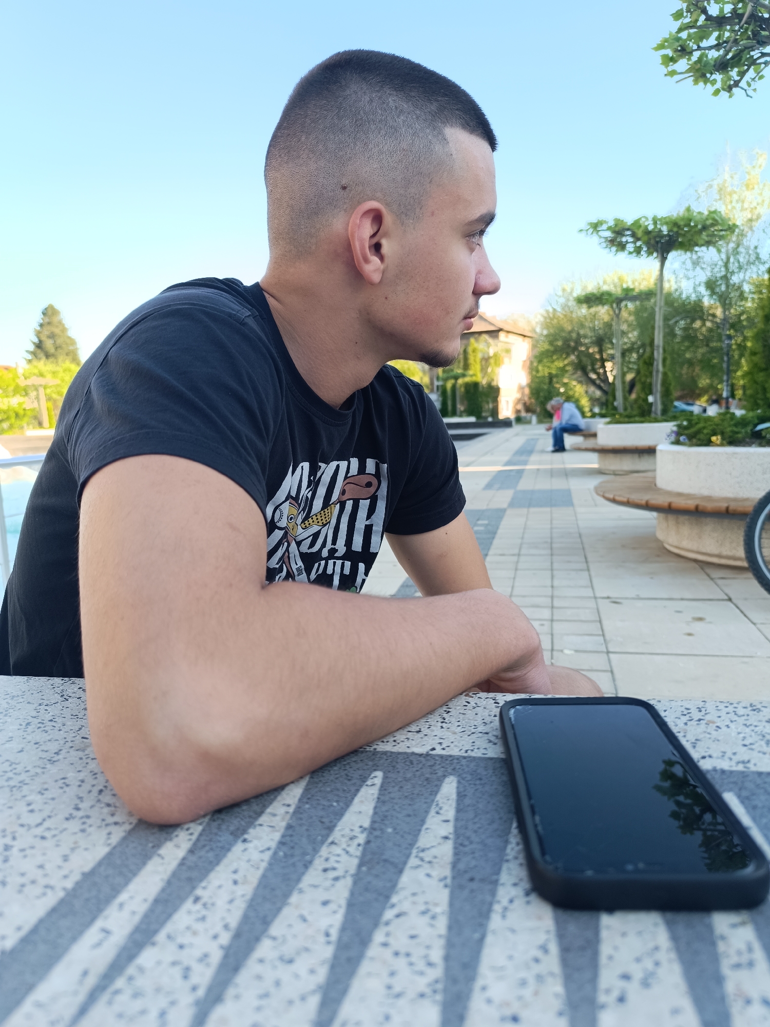 A young man with a close-cropped haircut is seated at a table in an outdoor public space. He is wearing a black t-shirt with a graphic print. His arms are resting on the table, and he is looking off to the side. A black smartphone is positioned on the table next to his arms. In the background, there are benches, trees, and other people. The location appears to be a park or plaza in the city of Septemvri, Bulgaria.
