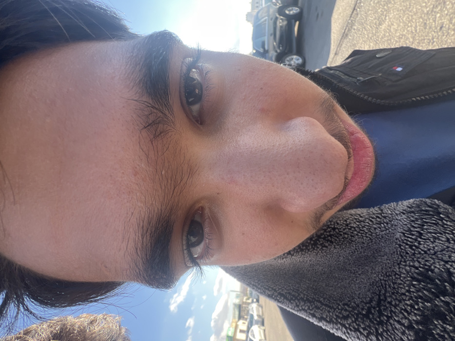 A close-up, wide-angle perspective depicts a young male outdoors in Jaber as-Sirhan, Jordan. The male's face dominates the frame, exhibiting dark hair, prominent eyebrows, dark eyes gazing directly forward, a broad nose, and visible lips with a faint mustache and chin stubble. He wears a dark blue shirt beneath a black jacket featuring a grey faux fur collar on the left side and a small red, white, and blue emblem on the right chest. The background shows a bright, clear blue sky with scattered clouds. To the viewer's left, a street or parking lot contains several parked light-colored vehicles and distant buildings with green accents. To the viewer's right, a dark SUV is parked on a paved surface. A portion of a dried plant or tree is visible in the upper left corner. The scene is illuminated by strong natural daylight.