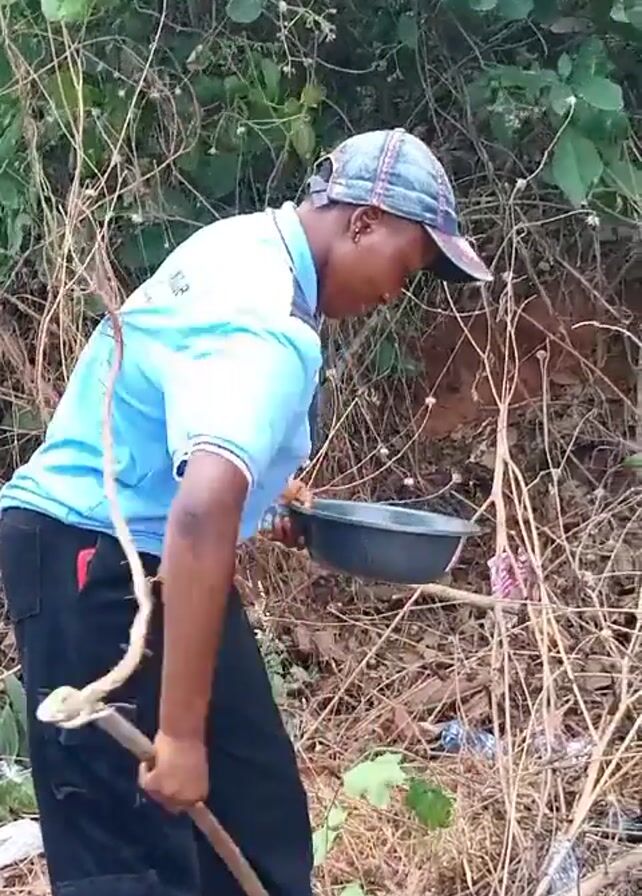 A woman stands outdoors among foliage and some scattered trash. She wears a blue and black short-sleeved polo shirt, black pants with multiple pockets, a baseball cap, and sandals. She holds a dark gray bowl with white objects in it and also holds a long, slender stick. She looks directly at the camera and speaks. Her facial expression appears serious. The foliage behind her is green and brown.
