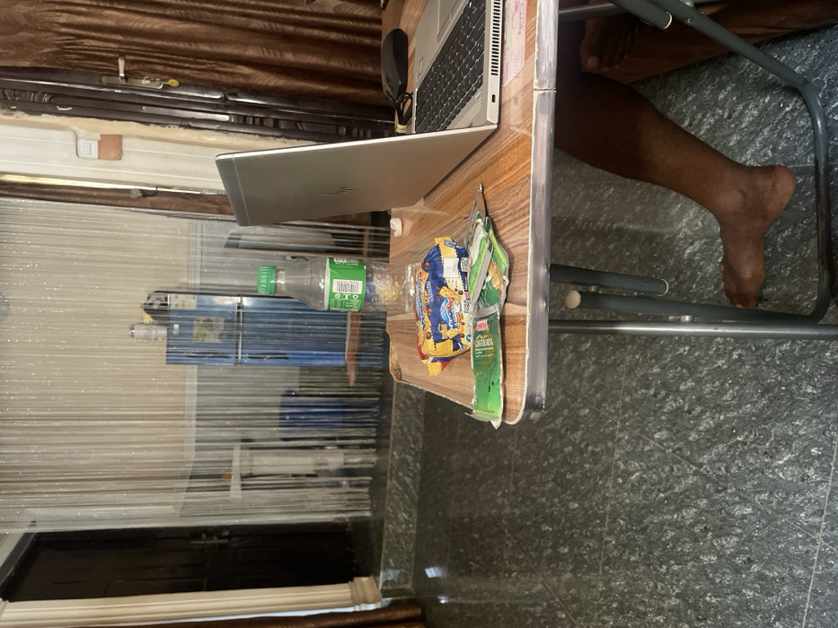 The scene depicts an indoor environment in Markurdi, Nigeria, featuring a dark-skinned individual seated at a wooden folding table with a metallic frame. The person's bare lower right leg and foot are visible beneath the table. On the table, an open silver laptop is positioned on the right, accompanied by a black computer mouse. To the left of the laptop, a clear plastic bottle with a green cap and label stands next to a blue and yellow packet of "Munch It" biscuits resting on several discarded green and yellow snack wrappers. The floor consists of dark grey, speckled tiled surfaces. In the background, separated by a shimmering, translucent string curtain, a dark wooden door with a metal handle is visible on the left, adjacent to a white pedestal sink or basin. Further right, a two-door blue refrigerator is present. A brown, patterned curtain frames the right side of the image.