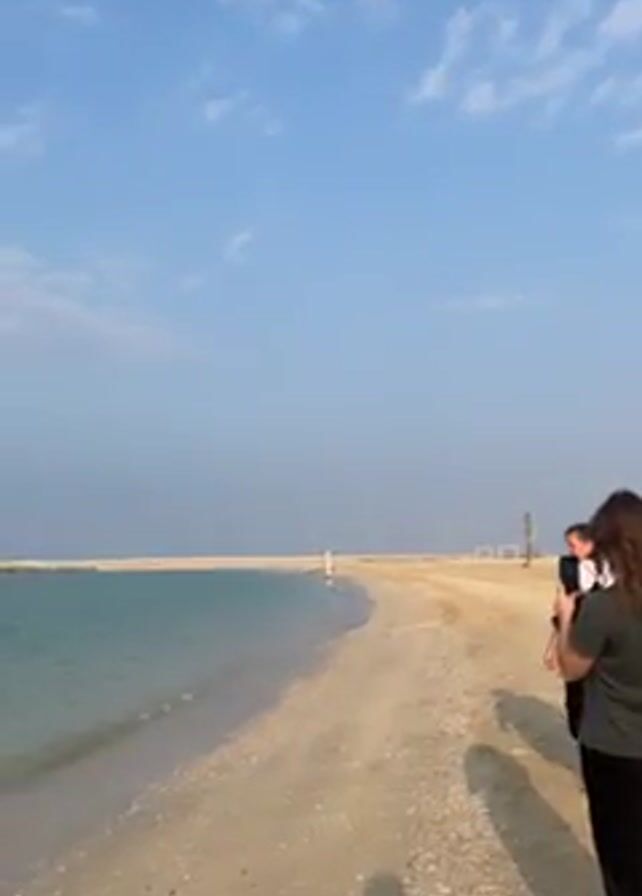 beach scene with a woman standing on the sand, holding a camera and seemingly filming. The beach stretches along the coast, with calm water visible on one side. In the background, there is a structure or barrier extending into the water. The sky is blue with some clouds. Another person walks past the woman holding the camera.