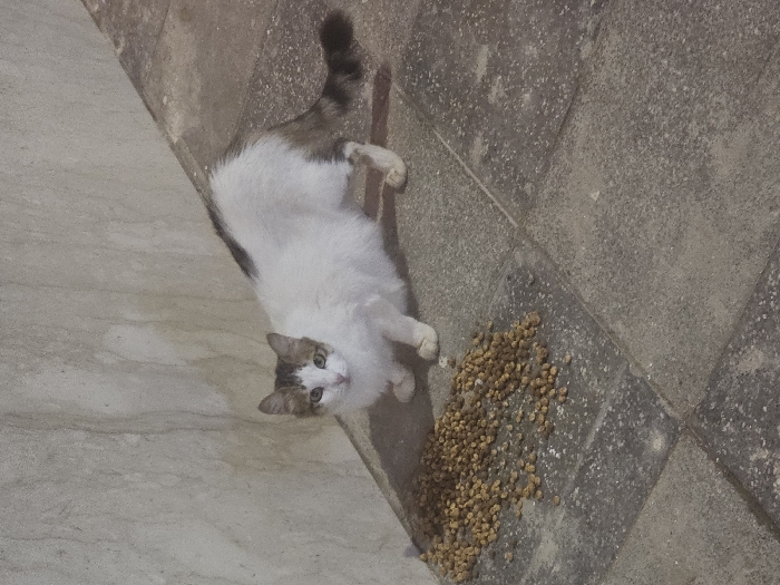 A white and tabby cat lies on a tiled surface, looking up at the camera. A pile of dry cat food is scattered on the adjacent tile. The cat's body is angled, with its head close to the food and its tail extending upward. The background consists of light-colored tiles of varying textures and shades.