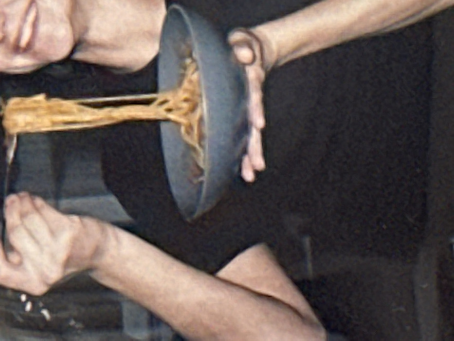 A close-up image depicts a person consuming food. The individual's left hand holds a silver-colored fork, from which a long strand of light brown noodles or pasta is suspended vertically, partially above a dark-colored ceramic bowl. The person's right hand supports the base of the same bowl. A portion of the individual's face, specifically the lower right side including the mouth area, is visible, indicating a smile. The individual wears a dark-colored short-sleeved garment. The background is dark, indistinct, and out of focus, suggesting an indoor setting. This scene occurs in Ericeira, Portugal. The image exhibits graininess.