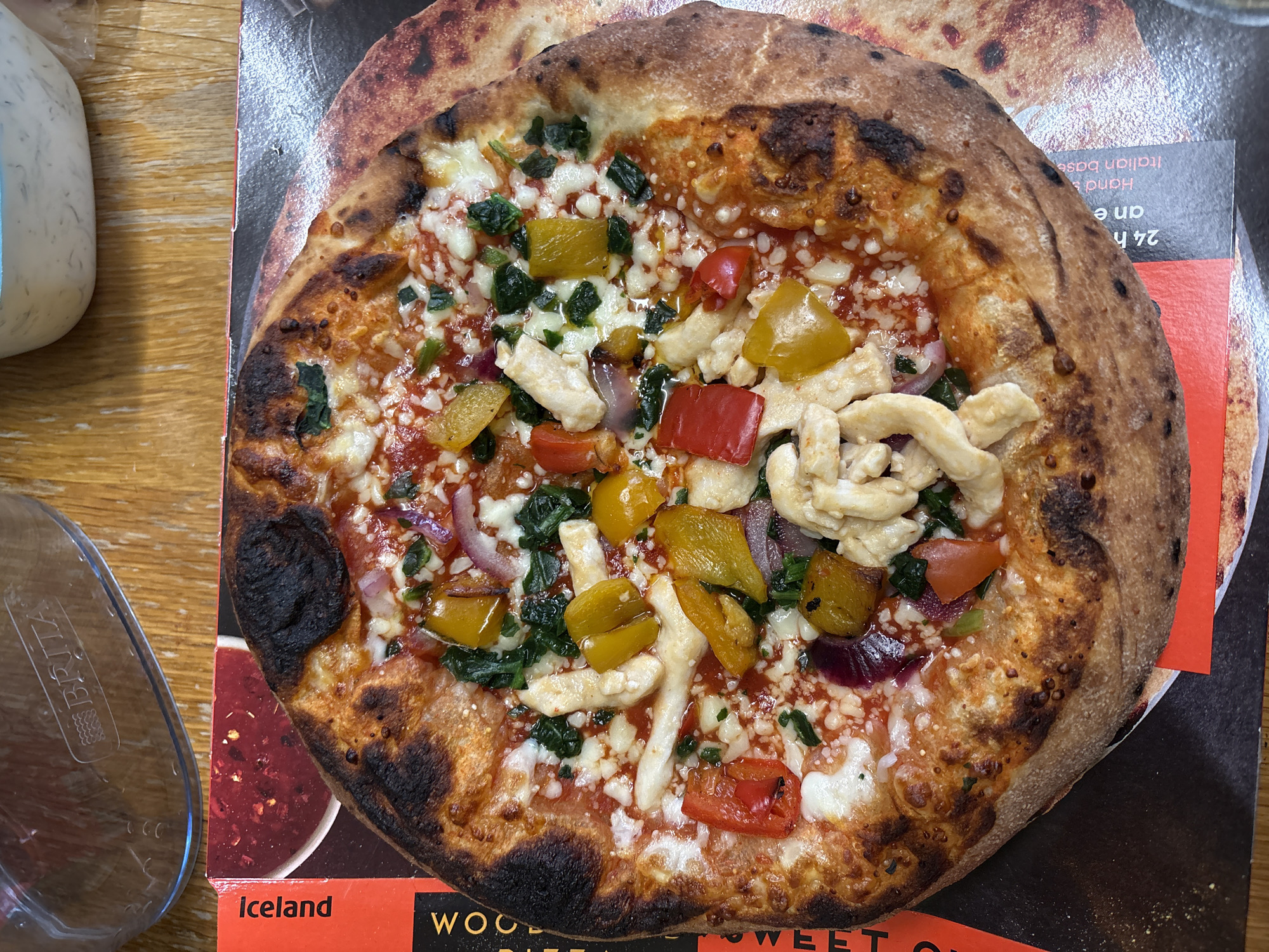 pizza on top of a cardboard pizza box. The pizza has a charred crust and is topped with tomato sauce, mozzarella cheese, red onions, yellow bell peppers, red bell peppers, spinach, and pieces of chicken. The pizza box has branding and text visible, including the word "Iceland" and parts of words such as "WOOD" and "SWEET". There is also a Brita water filter pitcher and a bottle of ranch dressing on the wooden table next to the pizza and pizza box. The photo was taken on a table, and the pizza is sitting on top of its original cardboard box. There are no people visible in the image. The location in the city of Oswestry, United Kingdom, is not mentioned in the image or description.