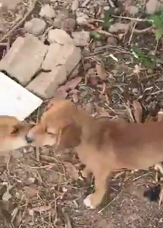 two small brown puppies outdoors in a cluttered environment with a mixture of dirt, rocks, leaves, twigs, and bits of debris on the ground. One puppy appears slightly smaller than the other and has white paws. The puppies are interacting, sniffing each other. One puppy stands on its hind legs and sniffs upward at a concrete block structure. The camera's perspective is from above, looking down at the puppies.
