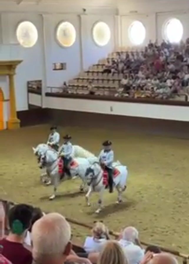 - "Inside a large arena filled with spectators, three riders in matching traditional outfits perform a dressage routine on three white horses" by FM-E1hwL2, licensed under CC BY 4.0