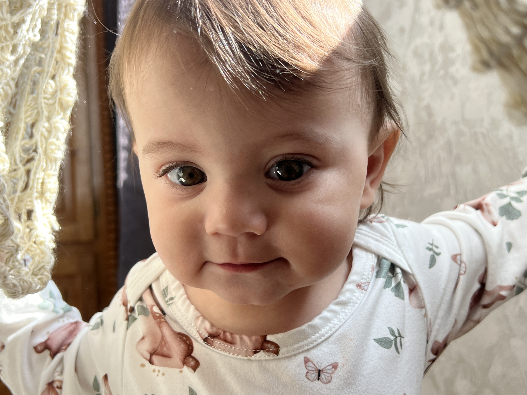 A close-up, front-facing portrait depicts an infant or young toddler located indoors in the city of Elena, Bulgaria. The subject has fair skin, dark brown eyes, and light brown hair with sunlit highlights on the top of the head. The infant wears a white long-sleeved garment patterned with light brown deer, green foliage, and pink butterflies. The expression is neutral with slightly parted lips and a direct gaze towards the viewer. A cream-colored, textured, open-knit fabric object, possibly a blanket or curtain, is visible along the left edge of the frame, partially obscuring the subject's left side. The background is softly blurred, showing a dark vertical element behind the knit on the left and a lighter, indistinct surface on the right. Strong directional light illuminates the scene from the right.