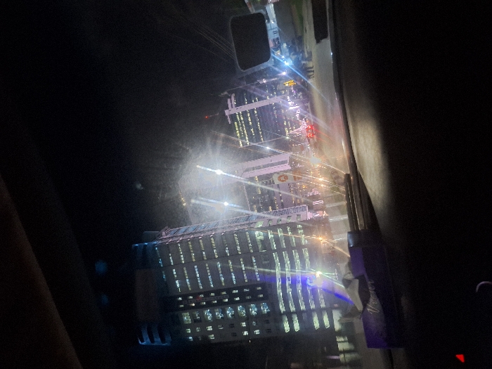 The image depicts a nighttime urban street scene in Itirin, Nigeria, viewed from the interior of a vehicle through a windshield. In the foreground, a purple tissue box with visible white tissues rests on the vehicle's dashboard. Beyond the windshield, an active roadway is visible. On the left, a tall, multi-story building stands prominently, illuminated by numerous lights from its windows, with blue structural elements apparent near its upper section. The central and right portions of the scene are dominated by intense artificial lights, generating significant lens flares, which partially obscure details. Behind these lights, additional multi-story buildings are discernible. A red vehicle's taillights are visible on the road, alongside other less distinct vehicle lights. On the right side of the road, a small group of approximately three to five individuals is standing near the curb. The overall environment is brightly lit by streetlights, vehicle lights, and building illumination.