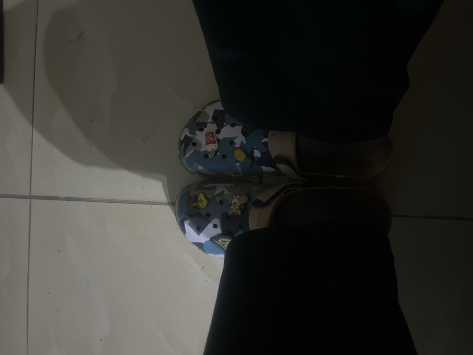 The image presents a first-person, downward view of an individual's lower legs and feet. The subject is wearing dark-colored trousers, visible on either side of the frame, and a pair of Crocs brand clogs. The clogs feature a blue, grey, and white camouflage pattern. The left clog is adorned with a yellow palm tree charm, a light brown stylized animal charm, and a light blue abstract charm. The right clog displays a red cup with a white straw charm, a yellow pineapple charm, and a white abstract charm. The feet rest on a light-colored, possibly beige or off-white, tiled floor with visible grout lines. An elongated shadow, consistent with an overhead light source and the observer's upper body, stretches across the tiles to the right of the feet. No specific location within Abuja, Nigeria, can be ascertained from the visual evidence.