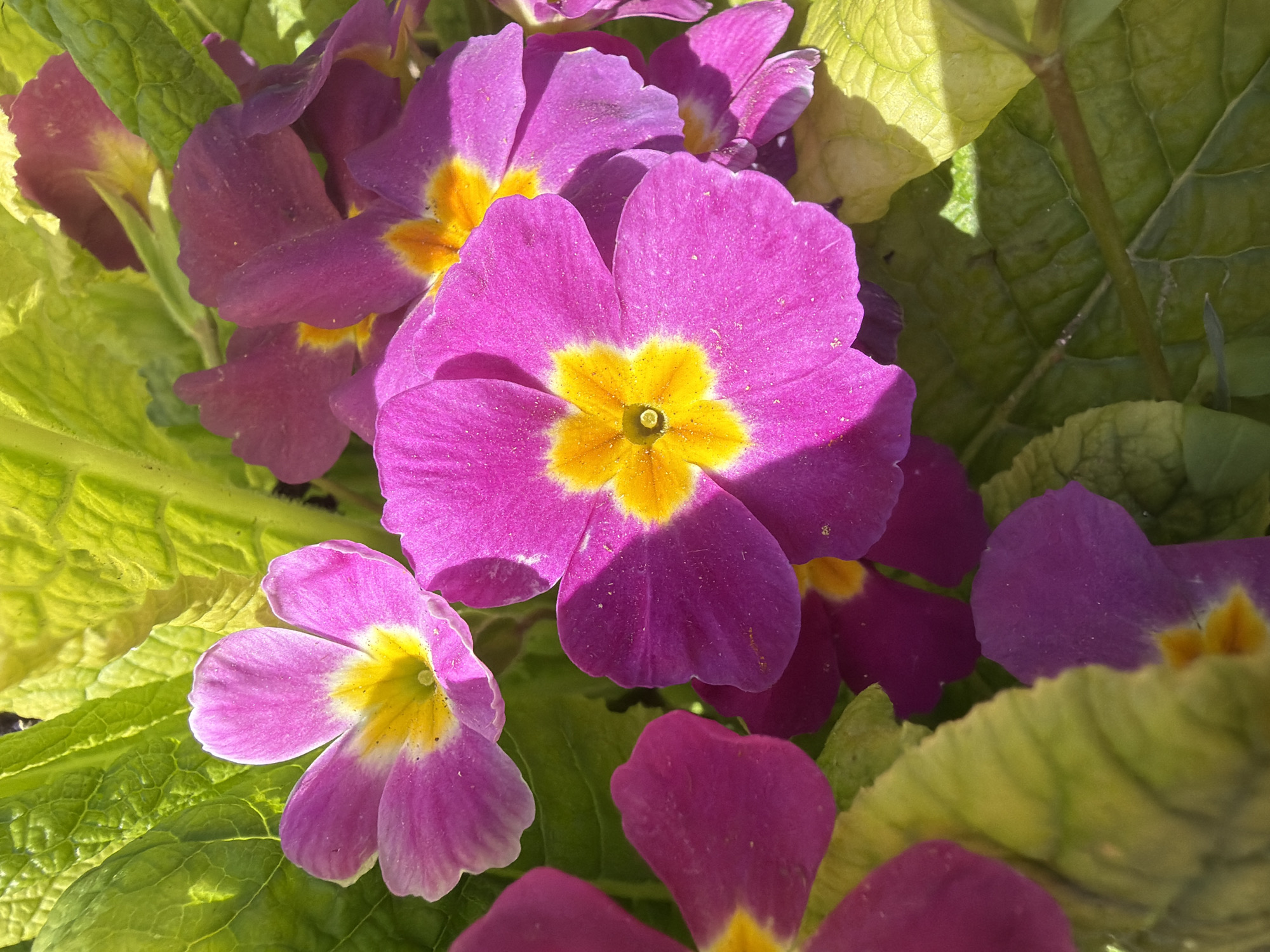 close-up view of a cluster of purple and yellow primrose flowers surrounded by green leaves
