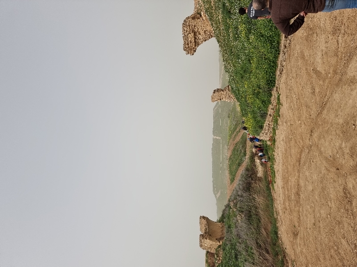 The image depicts an outdoor scene within the Lachish Regional Council, Israel, under a light gray, overcast sky. A wide, unpaved dirt path dominates the foreground and center, leading downhill into a valley. This path is bordered by elevated terrain covered in green vegetation, including grasses and plants with yellow flowers. On the left and right sides, two distinct structures of weathered stone ruins are prominently situated atop these vegetated mounds, framing the view into the distance. In the mid-ground, a group of approximately eight to ten individuals, dressed in casual clothing, walks along the dirt path, descending into the valley. In the immediate foreground, on the right, a person wearing a dark brown long-sleeved shirt and blue jeans stands with their back partially to the camera, facing the valley. Ahead of them, another individual in a black t-shirt with white lettering on the back is visible, walking in the same general direction as the larger group. In the far background, beyond the valley, agricultural fields or terraced land with visible cultivation patterns are discernible under the hazy conditions.