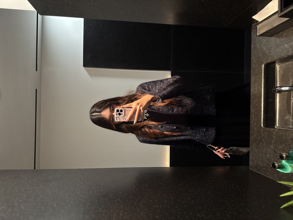A person wearing a dark, sparkling jacket takes a selfie in a bathroom