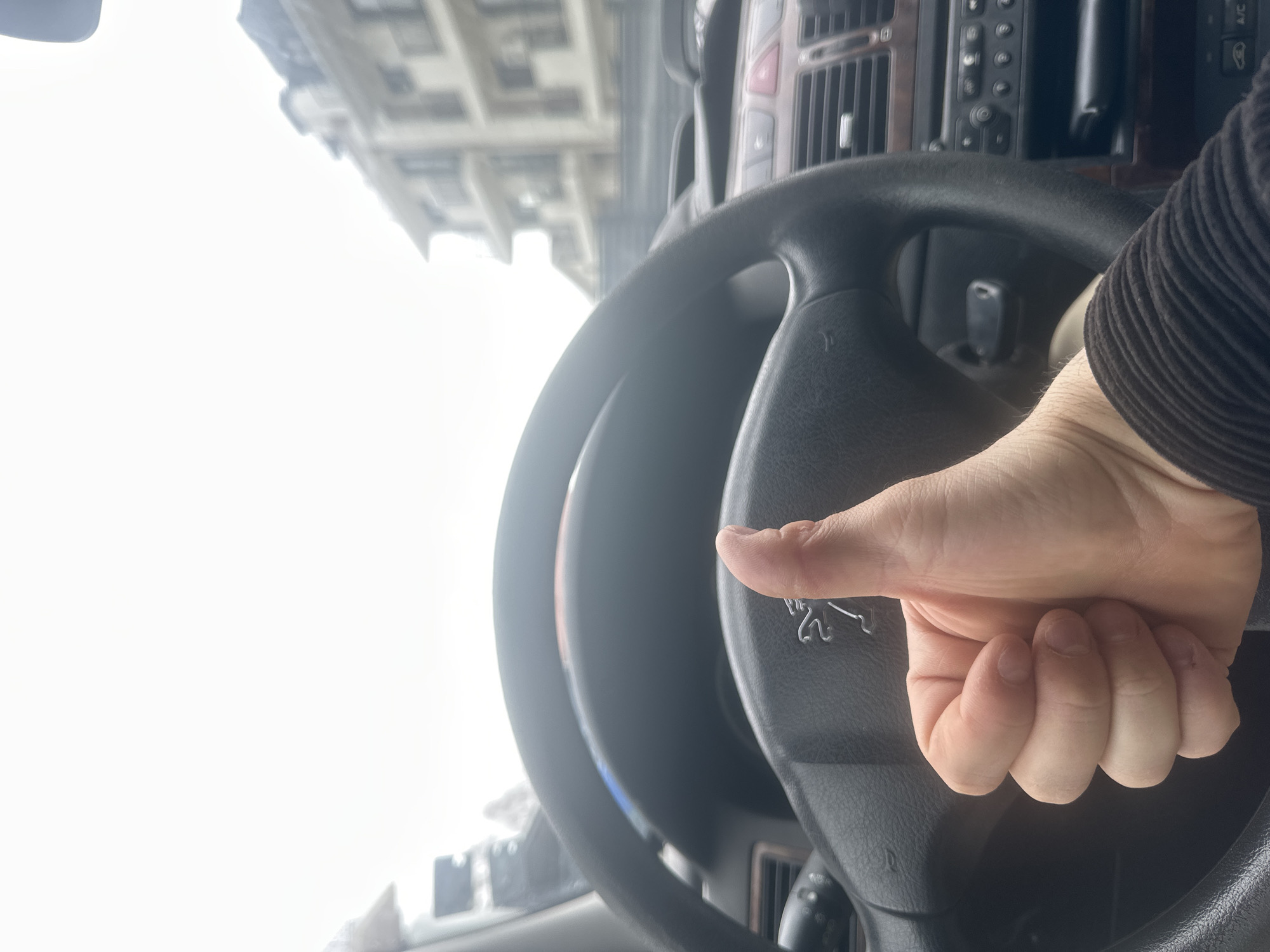 A person is giving a thumbs-up gesture while sitting in the driver's seat of a car. The interior of the car is visible, including the steering wheel with the Peugeot logo, the dashboard, and controls. Through the car's windshield, a blurry view of a building can be seen. Based on the architectural style of the building visible through the windshield, and the presence of a Peugeot steering wheel, it is possible this is Sofia, Bulgaria, as Peugeot is a common car brand in the region, and the architectural style matches some buildings in Sofia. The person's hand is in the foreground, and the focus is on the interior of the car and the view outside.