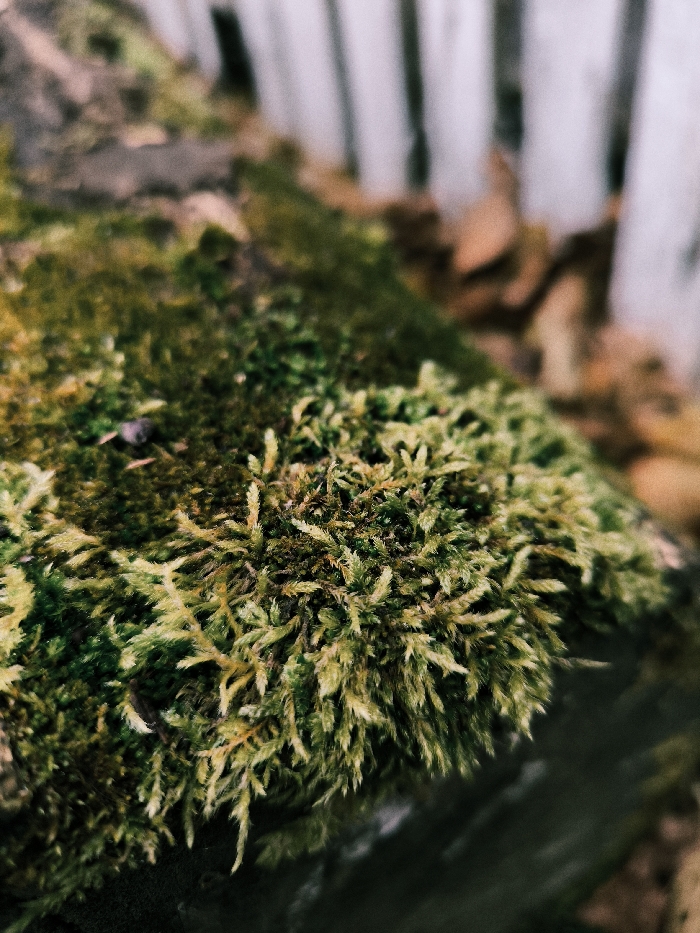 The image captures a close-up, macro-level view of a patch of moss thriving on a surface in Parkhomivka, Ukraine. The foreground is dominated by dense, vibrant green and yellowish-green moss, exhibiting a textured, feathery appearance. Individual moss fronds are clearly visible, varying in length and density across the illuminated surface. In the background, out of focus, blurred vertical elements with a pale, whitish-grey hue are present, consistent with wooden fence posts or narrow tree trunks. Below these vertical elements, diffused patches of brown and orange, likely dry leaves or earth, are visible. No human subjects or distinct objects other than the natural vegetation are present. The lighting appears natural and diffused.
