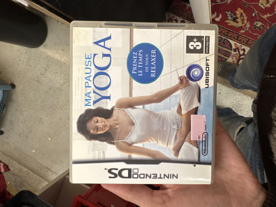 A person's left hand holds a clear plastic Nintendo DS game case in the foreground. The game case features "MA PAUSE YOGA" as its title and depicts a woman with dark hair, wearing a white camisole and shorts, seated cross-legged in a meditative pose on a light blue mat. A small pink Nintendo DS console is positioned on the mat in front of her. Text on the case includes "NINTENDO DS," "PRENEZ LE TEMPS DE VOUS RELAXER," along with Ubisoft, Nintendo, and PEGI 3+ logos. Below the game case, the person's legs are visible, dressed in ripped blue denim jeans and dark footwear. The floor beneath transitions from light-colored concrete or tile with visible grout lines in the upper background to a red and beige patterned rug in the lower right. A red plastic crate, a light blue perforated plastic stool, and a tall dark cylindrical object are visible in the background. The scene is located in Montreuil, France.