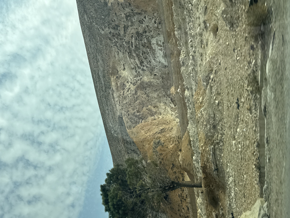 The image displays a rugged, arid landscape situated within the city of Ma'raba, Syria. The sky occupies the upper portion, featuring a light blue hue with numerous scattered white cirrocumulus clouds. The dominant feature is a steep, rocky hillside or mountain face that extends across the upper two-thirds of the frame. The upper slope appears dark grey, likely indicating sparse vegetation or shadowed rock. Below this, the hillside presents distinct geological features: a prominent section of light brown-tan rock on the left transitions into exposed white, light grey, and dark grey rock formations with visible stratifications and erosion patterns. Small, faint, dark rectangular openings, possibly caves or structures, are visible within the rock face, and a subtle, light-colored building-like structure is faintly discernible on the lower-mid brown section of the hill. The lower third of the image constitutes a disturbed foreground composed of loose soil, gravel, and various sizes of rock debris, forming uneven mounds and a generally uncultivated surface. A single, mature conifer tree with dense green foliage stands on a raised earthen mound in the lower-left quadrant. The very bottom of the frame reveals a horizontal concrete edge or barrier, suggesting the immediate proximity of a paved surface or road. No individuals or active interactions are present in the scene.