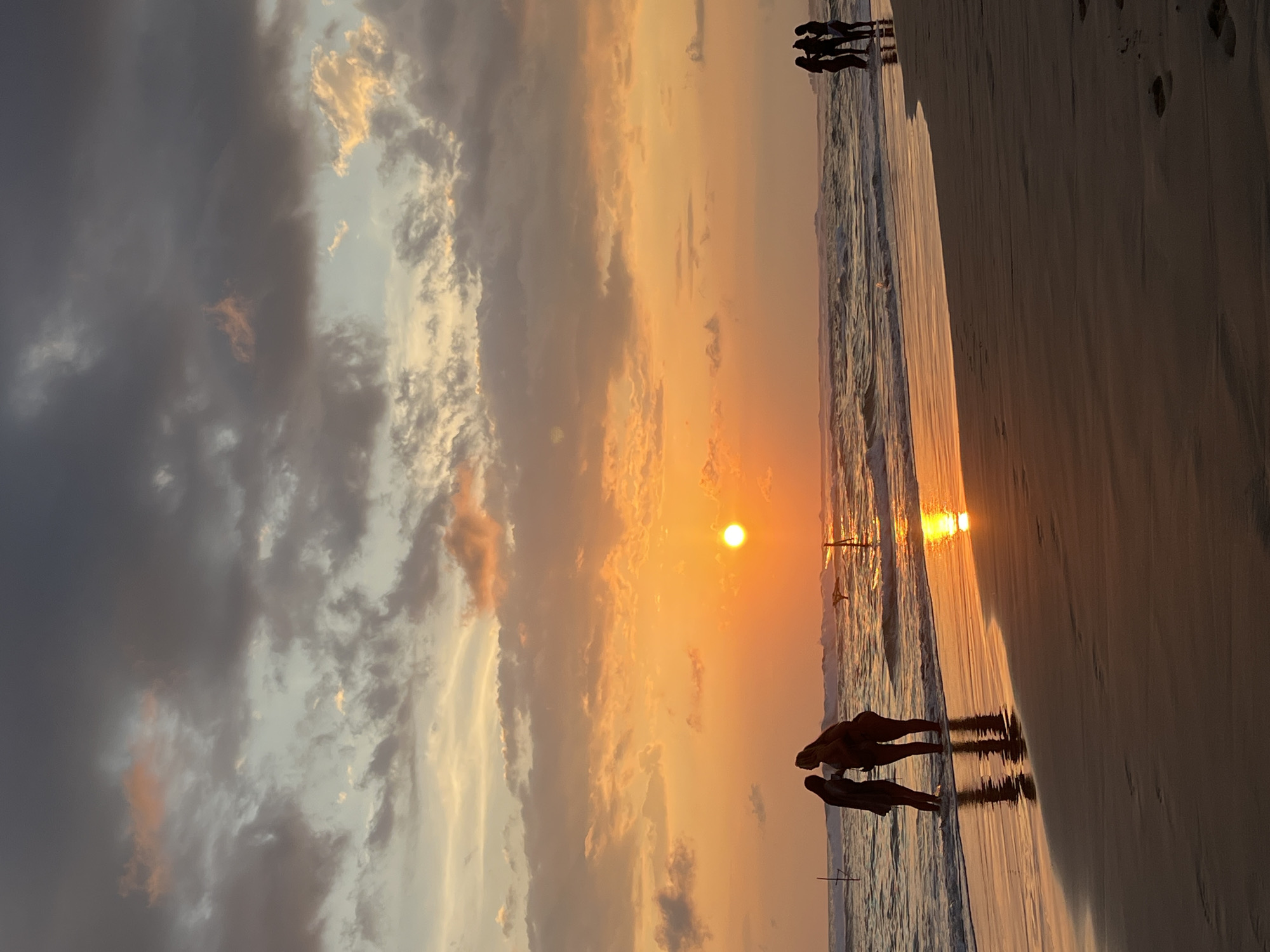 This image depicts a coastal scene at sunset in Kathaluwa, Sri Lanka. The sun, a bright orange orb, is low on the horizon, positioned in the lower-left quadrant of the frame, casting an intense orange and yellow glow across the sky and reflecting on the ocean's surface and wet sand. The upper sky displays a gradient of dark grey, lighter grey, and soft orange clouds. In the foreground, two individuals are silhouetted, standing in the shallow water on the left side of the frame, facing each other. Their reflections are visible on the wet sand. Further to the right, three additional individuals are silhouetted, also standing in the shallow water and appearing to be grouped together. The ocean exhibits moderate waves breaking on the shore, with white foam visible. Several thin, vertical structures, consistent with stilt fishing poles, are visible in the water at various distances. The sandy beach in the foreground transitions from wet, reflective sand near the waterline to drier sand further back, where faint footprints are discernible.