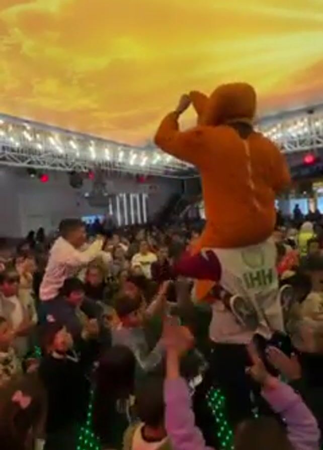 party atmosphere, likely a children's event. A person in a large orange squirrel costume is being carried on someone’s shoulders through a crowd of children and adults. The person carrying the mascot wears a white shirt with green and brown lettering. The crowd is densely packed and appears to be dancing and reaching towards the mascot. The ceiling is decorated with a simulated sky and cloud pattern with a bright light in the center, simulating the sun. There are string lights and other decorations visible throughout the room, suggesting it is an indoor party space.