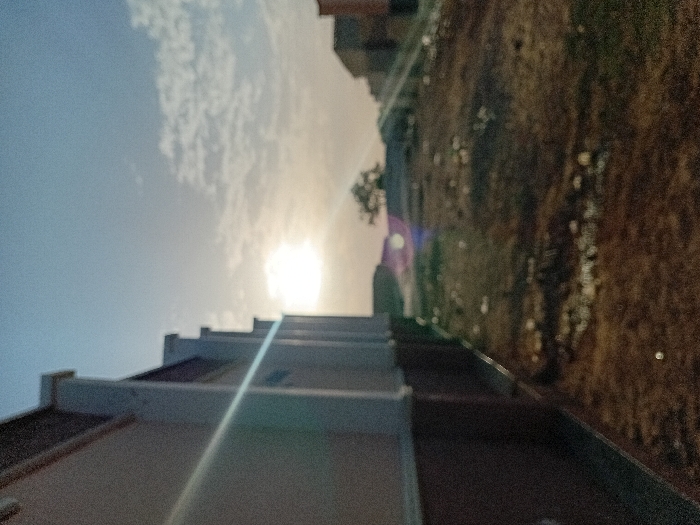 A view of outdoor stairs leads to a bright, diffused sun in a cloudy, blue sky. A building element is to the left of the stairs. To the right of the stairs is dirt and sparse vegetation with a few small buildings visible in the background. The image has lens flare effects. The photograph is taken from a low angle.