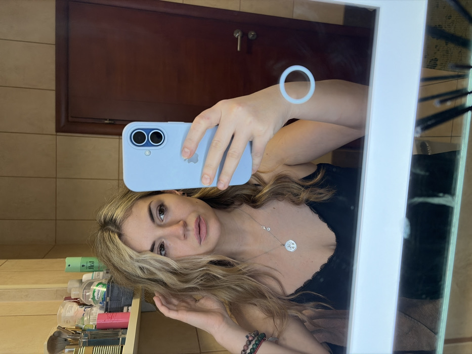 A woman takes a selfie in a bathroom mirror. She holds a light blue phone. She has blonde hair, fair skin, and wears a black top with lace trim, and a necklace. Reflected in the mirror are bathroom shelves with various toiletries, a brown wooden door, and a ring light on the mirror. The mirror has a bright white frame and vertical light. The image is oriented vertically.