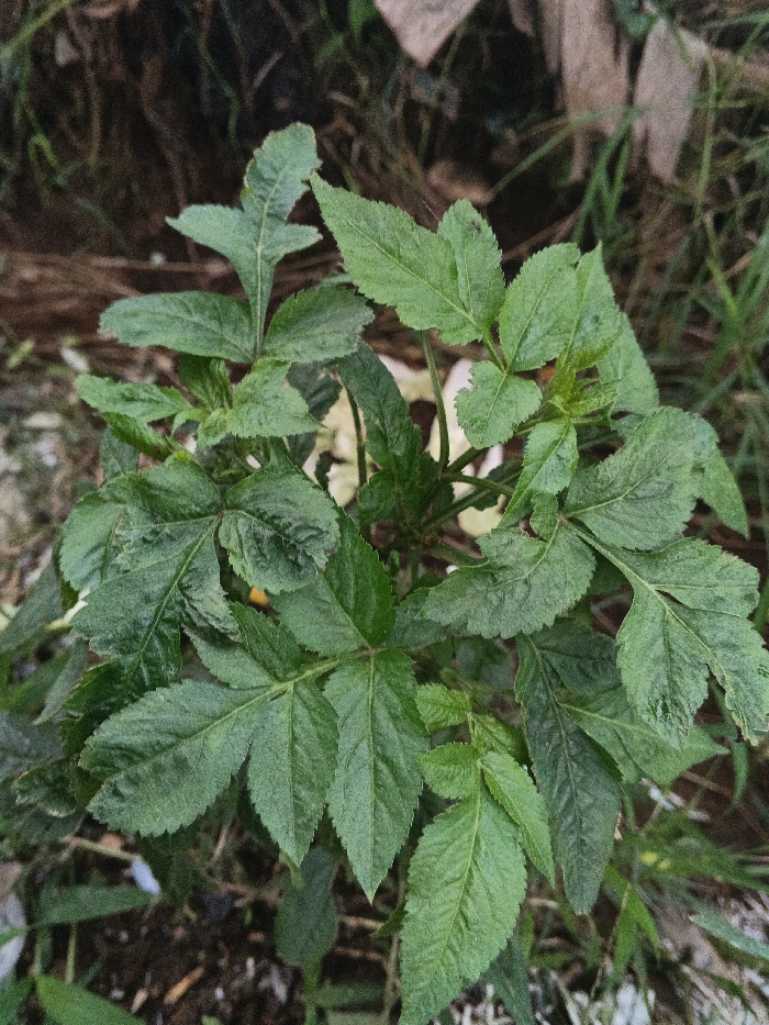 A close-up, top-down perspective captures a vibrant green plant situated outdoors in Banteay Srei, Cambodia. The plant is characterized by numerous compound leaves, each displaying prominently serrated margins and varying shades of green. Some leaves exhibit minor, irregular perforations consistent with insect damage. A small, dark insect, possibly a fly, is visible resting on one of the leaves in the upper right quadrant of the frame. The immediate background is blurred, showing a mix of darker green foliage, brown soil, and scattered organic debris. No human subjects, man-made objects, or overt actions are present. The scene is illuminated by diffused natural light.